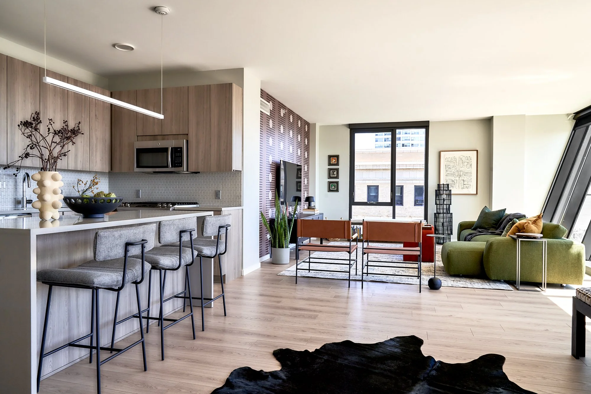 Inspired by New Orleans’ culture, jazz, and music scene, the design for this space is brimming with deep soulful colors, bold patterns, and sculptural statement pieces. Nothing is basic here! The architecture of this building (designed by Jeanne Gang) allowed us to push the envelope in scale and pattern. The soft curves of the furniture are perfect for the client who has two little boys who need space for play.